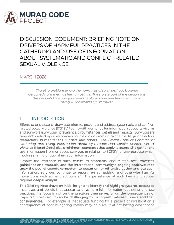 This Briefing Note seeks to identify and highlight systems, pressures, incentives and beliefs that appear to drive harmful practices in the gathering and use of information about systematic and conflict-related sexual violence (SCRSV). Based on desk-based research and the initial insights of practitioners from the media, humanitarian, justice and funding sectors, the Note looks beyond individual mistakes to the wider pressures and assumptions that shape how this work is carried out. The Note identifies three broad sets of drivers: structural drivers, operational drivers and normative drivers.