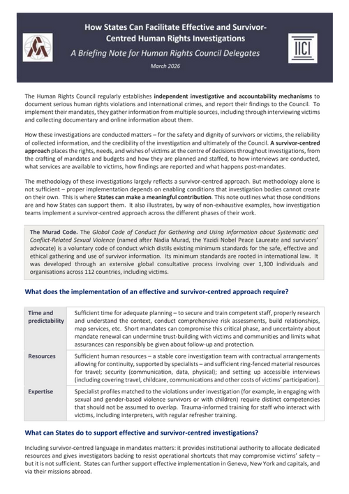 This briefing note is addressed to delegates of the Human Rights Council. It explains what a survivor-centred approach requires at each stage of a UN human rights investigation — commissions of inquiry, fact-finding missions, and similar mechanisms — from planning and preparation through to reporting and the conclusion of a mandate, and identifies concrete actions States can take to support its effective implementation.