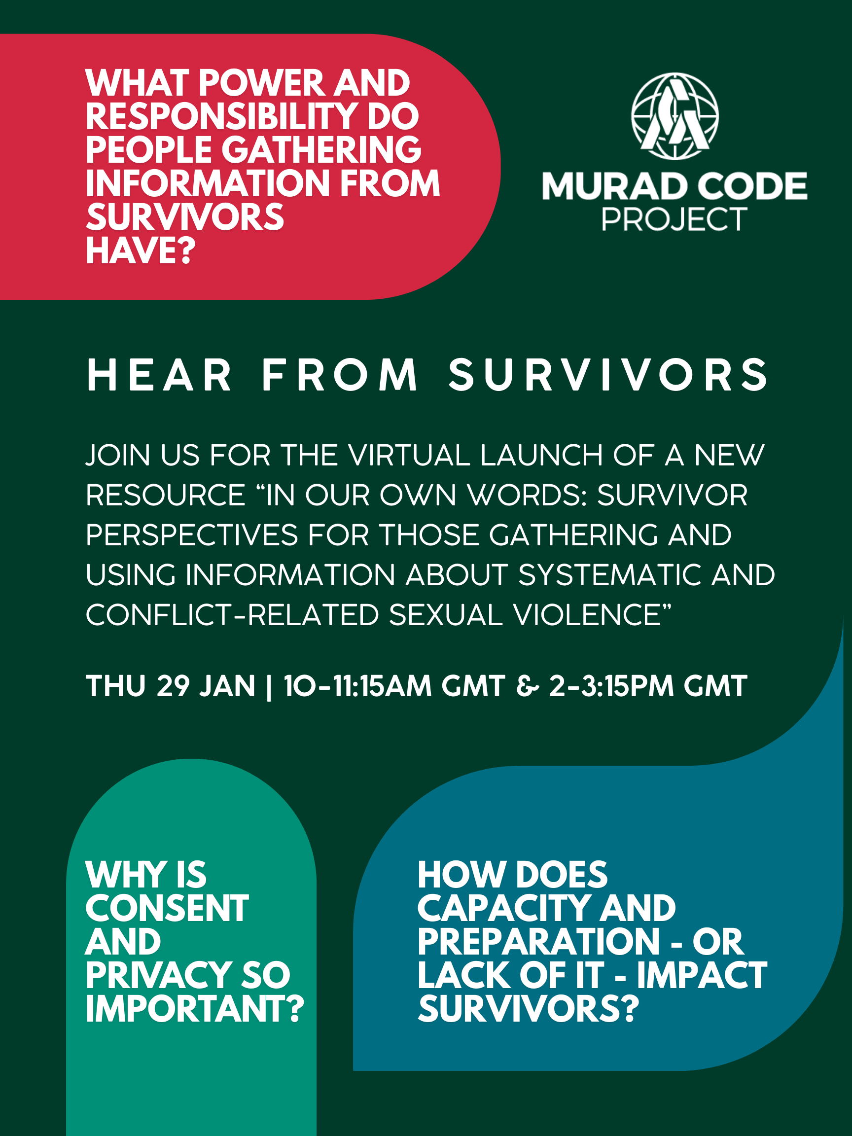 Two other new Murad Code Project resources will also be discussed: a tool for survivors called “10 important things to remember before, during and after an in-person interview”, and a briefing note on the harms that can be caused by poor information-gathering and use practices.