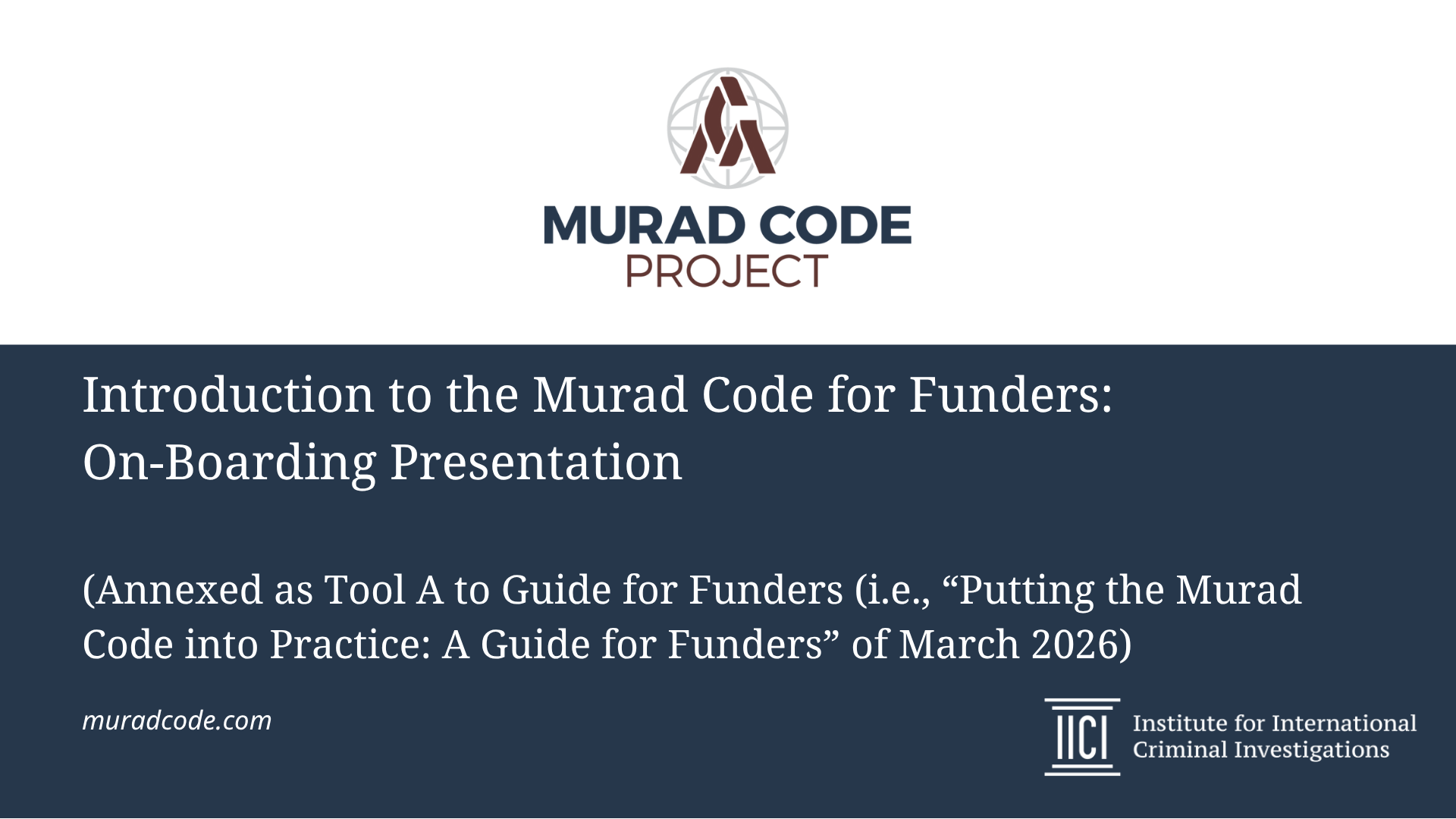 These presentations, developed by the Institute for International Criminal Investigations (IICI), have been made available in a range of languages to help practitioners raise awareness of and facilitate discussion about the Murad Code and its relevance for work that involves gathering and using information about SCRSV. The presentations can be viewed online via the links below. To request a copy that can be used offline, please email info@iici.global.
